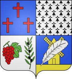 Keywords: Blason de la ville de Bezouce (30).svg blazon of en city of Bezouce Bezouce Gard Bezouce Gard fr Ecartelé au premier d'azur aux trois croisettes latines cousues de gueules mal ordonnées au deuxième d'hermine plain au troisième d'argent à la grappe de raisin de gueules feuillée d'une pièce de sinople senestrée d'un rameau d'olivier du même fruité de sable au quatrième d'azur au moulin à vent d'or sur une terrasse du même à la plume d'oie d'argent brochant en barre sur le tout it inquartato nel 1º d'azzurro a tre crocette latine cucite di rosso male ordinate; nel 2º d'armellino pieno; nel 3º d'argento al grappolo d'uva di rosso fogliato di un pezzo di verde sinistrato da un ramo d'olivo dello stesso fruttato di nero; nel 4º d'azzurro al mulino a vento d'oro su una terrazza dello stesso alla piuma d'oca d'argento attraversante in sbarra sul tutto spax89 Projet Blasons Own spax89 v -Blasons other versions Bezouce Contravention of no colour on colour Coats of arms of cities in Gard SVG coats of arms of France DEFAULTSORT Bezouce