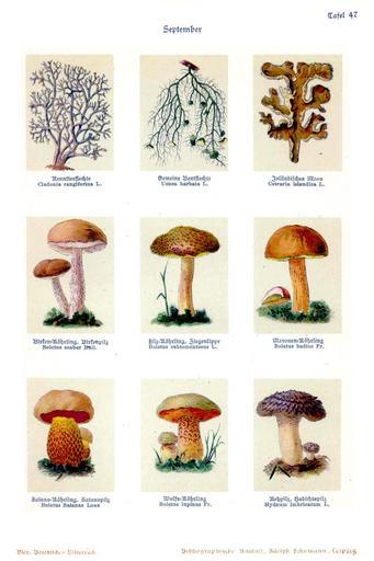 | Keywords: Bley, Botanisches Bilderbuch 47.jpg See below Botanisches Bilderbuch für Jung und Alt 1897 Franz Bley H Berdrow PD-old Renntierflechte jpg Latin 1 - Cladonia rangiferina L Usnea barbata L Cetraria islandica L - Boletus scaber Bull Boletus subtomentosus L Boletus badius Fr - Boletus satanas Lenz Boletus lupinus Fr Hydnum imbricatum L Deutsch 1 - Renntierflechte Gemeine Bartflechte Isländisches Moos - Birken-Röhrling Birkenpilz Filz-Röhrling Ziegenlippe Maronen-Röhrling - Satans-Röhrling Satanspilz Wolfs-Röhrling Rehpilz Habichtspilz Bley Botanisches Bilderbuch |