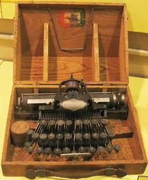 | Keywords: Blickensderfer typewriter 2.jpg Antique Blickensderfer typewriter invented by George C Blickensderfer 1850-1917 in 1891 and manufactured by the Blickensderfer Typewriter Co Stamford Connecticut USA This model is the Blickensderfer 5 the first commercial model manufactured beginning 1893-5 until after 1906 The typefaces were on a cylindrical typewheel seen at top which could be changed to type different fonts One of the first truly portable typewriters it had a DHIATENSOR type keyboard instead of the more common QWERTY For more information see http //www typewritermuseum org/collection/index php3 machine blick5 cat ks Blickensderfer 5 The Virtual Typewriter Museum Alteration brightened source image so details of machine can be seen Image Blickensderfer typewriter jpg 2005-12-22 Picture taken by Ian Ruotsala Released by Ian Ruotsala to public domain Image Blickensderfer typewriter jpg Ian Ruotsala Blickensderfer Typewriter Co Blickensderfer typewriters |
