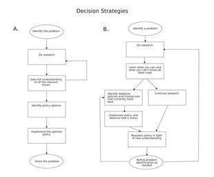 | Keywords: Block diagram showing an iterative and adaptive decision strategy (US CCSP).svg  climate change For decision strategy B policy is continually reassessed based on the success of previous policies and allowing for information based on new research See also economics of global warming Summary of diagrams Decision strategy A starts off with 1 identifying the problem at hand This flows to 2 do research This flows to 3 gain a full understanding of all the relevant issues This feeds back to 2 and to 4 identify policy options This flows to 5 implement the optimal policy This flows to 6 solve the problem Decision strategy B starts off with 1 identifying a problem This flows to 2 do research This flows to 3 learn what you can and what you can't know at least now This flows to two tasks 4 and 5 4 identify adaptive policies and choose one that currently looks best An adaptive policy can be revised based on new evidence 4 flows to 6 5 continue research 5 flows to 7 6 implement policy and observe how it works This flows to 7 Reassess policy in light of new understanding This flows to 8 Refine problem identification as needed This feeds back to 4 and 2 citation January 2009 Ch 7 Making Decisions in the Face of Uncertainty Fig 7 1 Synthesis and Assessment Product 5 2 Best practice approaches for characterizing communicating and incorporating scientific uncertainty in decisionmaking A Report by the U S Climate Change Science Program CCSP and the Subcommittee on Global Change Research Granger Morgan M et al National Oceanic and Atmospheric Administration Washington D C USA CCSP http //downloads globalchange gov/sap/sap5-2/sap5-2-final-report-all pdf Granger Morgan M et al 2009-01-01 Converted to svg Global warming Decision diagrams Enescot |