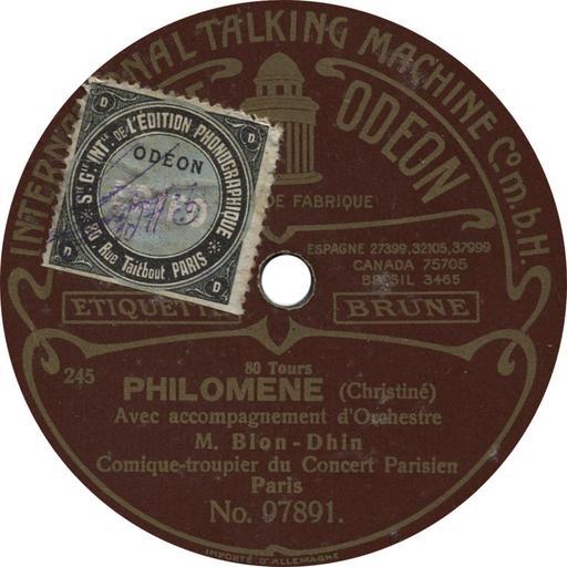 | Keywords: Blon D'hin Philomene.jpg en Disc label http //www dutempsdescerisesauxfeuillesmortes net/fiches_bio/blon_dhin/blon_dhin htm Du Temps des cerises aux Feuilles mortes Blon D'hin 1910 Vocalists from France 1910 in Paris Music in 1910 Record labels PD-old |