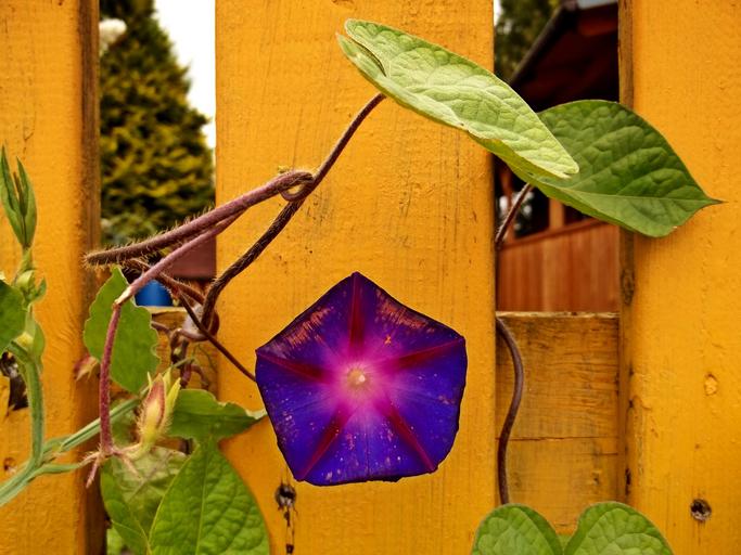 Keywords: blossom bloom flower fence yellow garden nature plant green purple violet shrubs