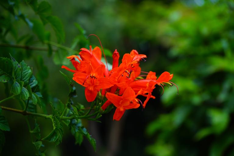 Keywords: blossom bloom red bush evergreen bush plant cape honeysuckle kapbignonie tecoma capensis tecomaria capensis bignoniaceae trumpet vine crop