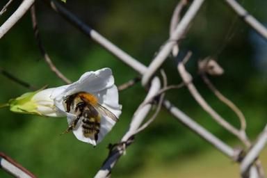 Keywords: blossom bloom white white blossom close bee pollen pollinate wire mesh fence climber food search collect hard working