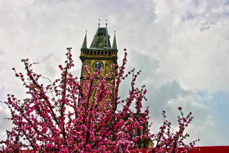 Keywords: blossoms flowers red tree branches profusion colour clock tower tower spire sky clouds tavasz torony prága floral flora