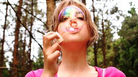 Keywords: blow bubbles girl forest happy face fir tree play nature