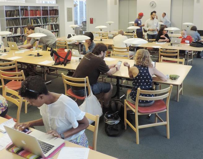 | Keywords: BLT edit a thon MoMA 2015-07-13 jeh.jpg en Looking south in 6th floor library at eagerly studious newbies and placid old timers MoMA edit-a-thon 2015-07 2015-07-13 18 41 09 own Jim henderson other versions 40 45 40 6 N 73 58 35 W heading S cc-zero Uploaded with UploadWizard |