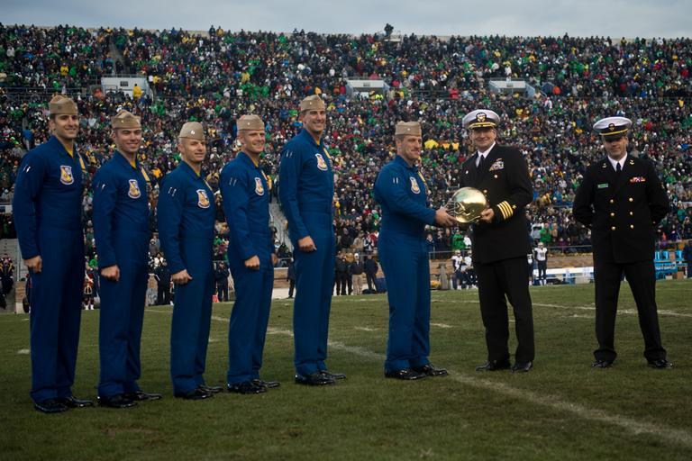 Keywords: Blue Angels 131102-N-SH953-140.jpg en Cmdr Tom Frosch commanding officer and flight leader of the U S Navy flight demonstration squadron the Blue Angels accepts a University of Notre Dame football helmet from Capt Michael Ryan commanding officer of the University of Notre Dame's Navy Recruit Officer Training Candidate ROTC unit during the National Collegiate Athletic Association NCAA football game between the U S Naval Academy and University of Notre Dame at Notre Dame stadium The helmet was a gift from Notre Dame Football Head Coach Brian Kelly The Blue Angels performed a flyover of the University of Notre Dame Stadium prior to kickoff U S Navy photo by Mass Communication Specialist 2nd Class Kathryn E Macdonald/Released 2013-11-02 Petty Officer 2nd Class Kathryn Macdonald https //www dvidshub net/image/1046694 131102-N-SH953-140 2013-11-04 23 12 PENSACOLA FL US PD-USGov-Military-Navy Notre Dame Stadium Blue Angels Images from DoD uploaded by Fæ |