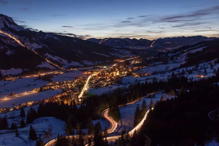 Keywords: blue hour night photograph winter mountains bad hindelang wellnesshotel allgäu lights road evening long exposure night sky mood