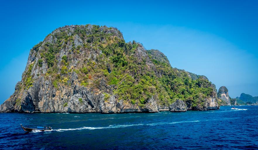 Keywords: blue sea ocean water cliff ocean view beautiful mountain hill green thailand island background beach colorful sun sky tree travel summer holiday tourism outdoor landscape boat longtail boat longtail natural oriental tropical azure sunrise golden brilliant speedboat