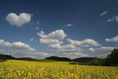 Keywords: blue sky forest nature trees distance yellow rape clouds heaven blue sky summer cyan landscape peace freedom field