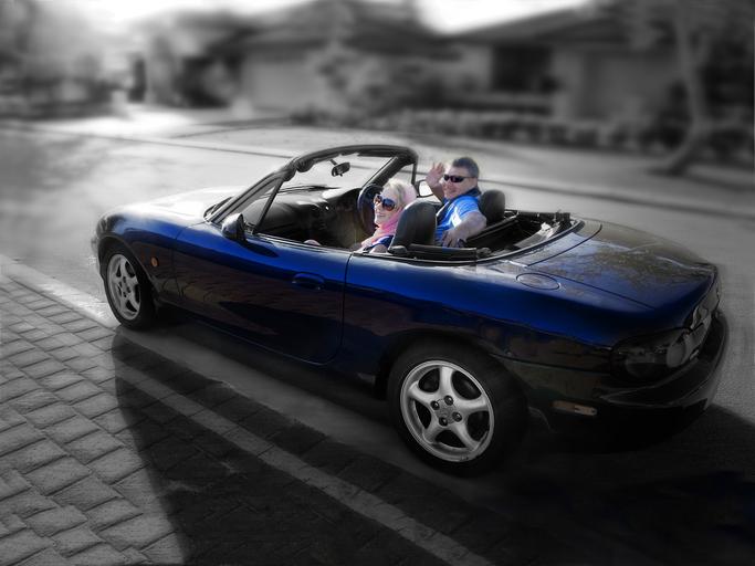 Keywords: blue sports car goodbye journey sunglasses vehicle car drive holiday road transport travel journey happy wave summer vacation smiling together cheerful happy holidays trip happiness leisure