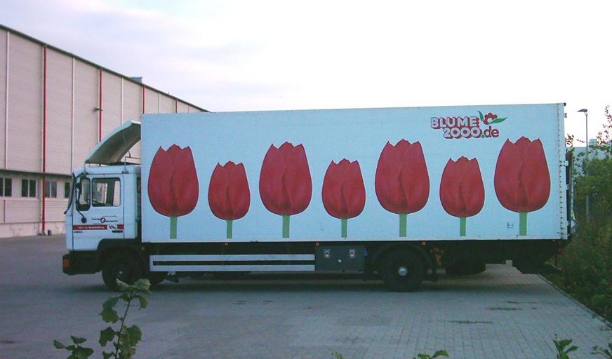 Keywords: Blume 2000 LKW.jpg LKW von Blume 2000 Hamburg-Hausbruch own 2006-10 GeorgHH for free use public domain Red flowers Side views of trucks Land vehicles facing left MAN cab-over-engine trucks Trucks of Germany White trucks Box rigid trucks