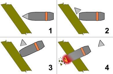 Keywords: Blunt head armour-piercing shell G1.jpg en Armour-piercing with a blunt nose projective penetrate armor ru Схема воздействия тупоголового а тилле ийского сна яда на б оневой лист 1 Состояние до соп икосновения; 2 Раз ушение баллистического наконечника; 3 Сна яд дово ачивается до но мали по отношению к плоскости б они; 4 П оникновение сквозь б оневой лист пе еход кинетической эне гии в тепловую об азование аскаленных осколков б они и сна яда Own George Chernilevsky 2009-05-27 Artillery ammunition Anti-tank ammunition |