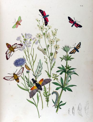 Keywords: BMAT1-06.jpg Scabious succisa Macroglossa stellatarum; Sesia bombyliformis; Sesia fuciformis; Ino statices; Anthorcera filipendulae; Anthrocera loti Plate 6 1845 British Moths and their Transformations Volume I 1845 http //caliban mpiz-koeln mpg de/westwood/moths1/high/IMG_3263 html Henry Noel Humphreys and John Obadiah Westwood PD-old Uploaded with UploadWizard British Moths and their Transformations Volume I |