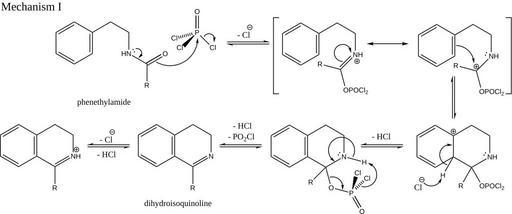 Keywords: BNR rxn imine-ester mechanism.svg Mechanism for the Bischler-Napieralski reaction own UbinusCol 2010-05-04 Bischler-Napieralski reaction