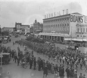 Keywords: Boans1.jpg en Boans department store Perth Western Australia c 1928 Includes brass band playing in street with crowd gathered to listen and The Grand Central Shaftesbury Hotel in background http //innopac liswa wa gov au/search~S1 /dWellington+Street+ 28Perth 2C+W A 29+--+Photographs /dwellington+street+perth+w+a+photographs/-3 2C-1 2C0 2CB/frameset FF dwellington+street+perth+w+a+photographs 23 2C 2C58 State Library of Western Australia See also http //www slv vic gov au/pictoria/b/1/3/doc/b13275 shtml - Similar image possibly from a different year taken by Harvey John Henry 1855-1938 photographer PD-Australia Original upload log en wikipedia FtCG page en wikipedia Boans1 jpg wikitable - 10 17 10 June 2009 435 × 389 63 647 bytes Gobeirne w en <nowiki> cleaner version </nowiki> - 14 22 5 May 2007 598 × 478 28 622 bytes Moondyne w en <nowiki> Cropped </nowiki> - 07 30 5 May 2007 704 × 528 36 615 bytes Moondyne w en <nowiki> Boans department store Perth Western Australia c 1938 Source http //www slv vic gov au/pictoria/b/1/3/doc/b13275 shtml PD-Australia </nowiki> Perth Western Australia |