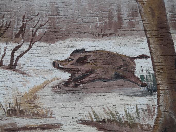 Keywords: boar painting race fear escape panic wild boar hunting image artwork drawing forest hunting nature