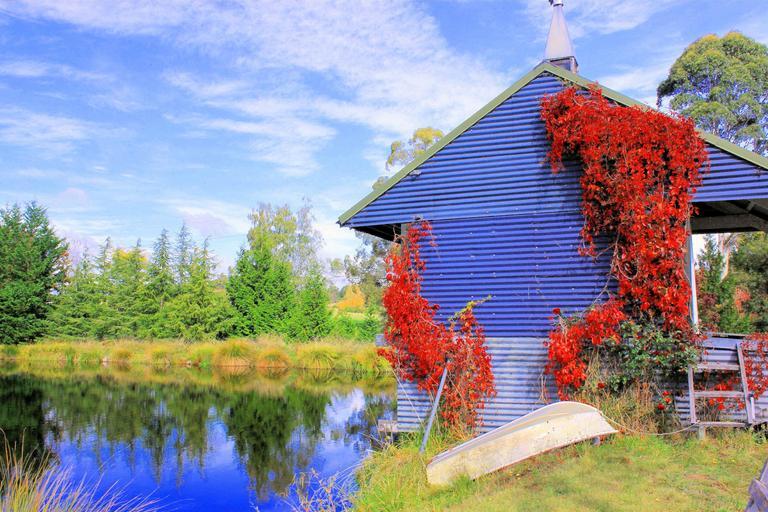 Keywords: boathouse scenic landscape autumn lake nelson south island new zealand blue water