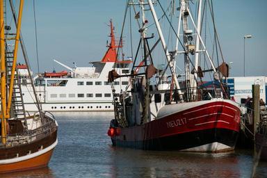 Keywords: boats port ships ferry fishing boats mast mirroring sea north sea docks neuharlingersiel water sky lake blue holiday