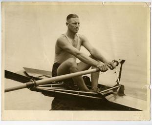 | Keywords: darling harbour darlingharbour new south wales newsouthwales australia row rowboat bobbypearce olympics henryrobertpearce miltonkent people photo border monochrome This black and white photograph of Henry Robert 'Bobby' Pearce (1905-1976) was taken by Milton Kent in Sydney. Pearce was the first Australian to win a gold medal in the single sculls. Later in 1928 he entered the prestigious Henley Diamond Sculls but was ruled ineligible because he was a carpenter by trade. The Henley race rules deemed anyone ineligible to compete who was 'by trade or employment for wages a mechanic, artisan or labourer'. He went on to win the single sculls at the British Empire Games in 1930 held in Hamilton Ontario. During the Depression, Pearce had difficulty finding employment despite his sporting reputation. After the Empire Games he worked picking up scraps of paper at the Sydney Show Ground to earn enough money to eat. Eventually he was offered a job in Canada by the Scottish whisky tycoon Lord Dewar who appointed Pearce as his Canadian sales representative. In 1931 with his new job and status as 'distinguished gentleman' Pearce was permitted to compete at Henley where he won the Diamond Sculls. Despite his Canadian residency, Pearce competed for Australia at the Los Angeles Olympics in 1932. Again he won the gold medal in the single sculls event. He then turned professional and went on the win the world title in 1933. The Australian National Maritime Museum undertakes research and accepts public comments that enhance the information we hold about images in our collection. If you can identify a person, vessel or landmark, write the details in the Comments box below. Thank you for helping caption this important historical image. Object number ANMS1288[021] This black and white photograph of Henry Robert 'Bobby' Pearce (1905-1976) was taken by Milton Kent in Sydney. Pearce was the first Australian to win a gold medal in the single sculls. Later in 1928 he entered the prestigious Henley Diamond Sculls but was ruled ineligible because he was a carpenter by trade. The Henley race rules deemed anyone ineligible to compete who was 'by trade or employment for wages a mechanic, artisan or labourer'. He went on to win the single sculls at the British Empire Games in 1930 held in Hamilton Ontario. During the Depression, Pearce had difficulty finding employment despite his sporting reputation. After the Empire Games he worked picking up scraps of paper at the Sydney Show Ground to earn enough money to eat. Eventually he was offered a job in Canada by the Scottish whisky tycoon Lord Dewar who appointed Pearce as his Canadian sales representative. In 1931 with his new job and status as 'distinguished gentleman' Pearce was permitted to compete at Henley where he won the Diamond Sculls. Despite his Canadian residency, Pearce competed for Australia at the Los Angeles Olympics in 1932. Again he won the gold medal in the single sculls event. He then turned professional and went on the win the world title in 1933. The Australian National Maritime Museum undertakes research and accepts public comments that enhance the information we hold about images in our collection. If you can identify a person, vessel or landmark, write the details in the Comments box below. Thank you for helping caption this important historical image. Object number ANMS1288[021] This black and white photograph of Henry Robert 'Bobby' Pearce (1905-1976) was taken by Milton Kent in Sydney.