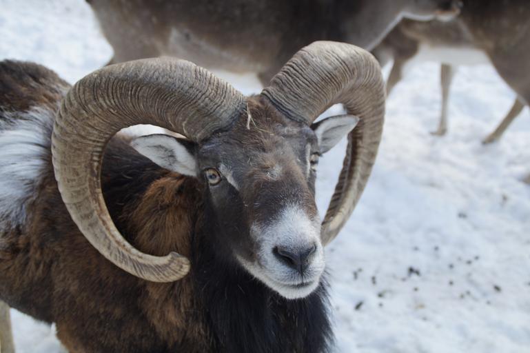 Keywords: bock sheep mouflon winter snow winter fur wintry cold white snowy animal mammal horns zoo petting zoo enclosure deer park