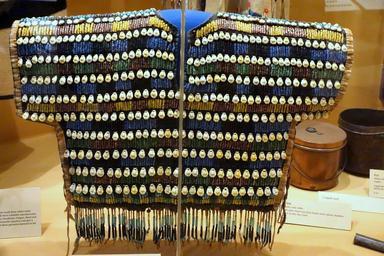 | Keywords: Bodice, Amsskaapipikani, early 1900s, cotton, glass beads, brass disks, cowrie shells, buckskin fringe - Glenbow Museum - DSC01062.JPG en Exhibit in the Glenbow Museum 130 9th Ave S E Calgary Alberta Canada This work is old enough so that it is in the public domain Photography was permitted in the museum without restriction 2013-09-21 12 49 11 own Daderot cc-zero Uploaded with UploadWizard Aboriginal peoples clothing in the Glenbow Museum Piegans | ||||