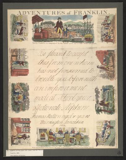 Keywords: Bodleian Libraries, Adventures of Franklin.jpg Writing blank of 1808 entitled Adventures of Franklin; Young Franklin accompanied by his father goes out to make a choice of trade; Bound apprentice to his brother the printer; Employed to distribute the news paper for his brother; He leaves his brother at Boston and lands in the night near Philadelphia after a dangerous voyage; He enters Philadelphia for the first time passes by the house of Mr Reed the father of his future wife; Becomes president for the Province of Pensilvania; His experiment on electricity with a kite; Opens a shop in Philadelphia as a printer conveys home the paper he purchases at the warehouses in a wheelbarrow; He enters a Quakers Meeting house in Philadelphia; He is sent ambassador to Paris where he signs articles of peace in conjunction with France between Gt Britain America; Adventures of Franklin single sheet; 465 x 365 mm; paper exhibition history Be pleased to accept this from one whom has not presumed to trouble you before with an improvement Allegro identifier 20031201/12 19 52 jl object history object type Licensed-PD-Art PD-old-100 cc-by-4 0 place of creation London England W T Darton place of discovery http //digital bodleian ox ac uk/inquire/p//6f87b712-f0bf-4cde-b084-6b41b394eeba Digital Bodleian Template John Johnson Adventures of Franklin Uploaded with GWToolset Bodleian Libraries Adventures of Franklin http //iiif bodleian ox ac uk/iiif/image/6f87b712-f0bf-4cde-b084-6b41b394eeba/full/ 1000 1000/0/default jpg Files uploaded by the Bodleian Libraries' Wikimedian In Residence Writing blanks Fathers and children Labour Sailing ships Construction in art Boat and ship industry Apprentices Printers Newspaper carriers Campfires Courtship Presidents Presidential inaugurations Kites in art Experiments Wheelbarrows Friends' meeting houses Peace treaties Benjamin Franklin |