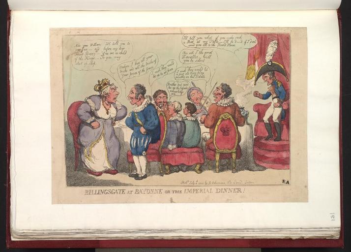 Keywords: Bodleian Libraries, Billingsgate at Bayonne or- The imperial dinner.jpg accession number Curzon b 4 181 Satire on the Peninsular war British political cartoon ; A satire on the disputes within the Spanish royal family between the prince Ferdinand VII and his father Charles IV who had abdicated The cartoon represents a scene on 5 May 1808 Restoration of the crown to Charles IV was in effect a resignation of the throne to Napoleon's influence Joseph Bonaparte was made king of Spain on 7 July 1808 ; Ink stamp in lower right corner RA 259 x 376 sheet ; 233 x 330 image and text mm; etching exhibition history Source filename politi004-acv-0001-0 object history object type Licensed-PD-Art PD-old-100 cc-by-4 0 place of creation London England R Ackermann place of discovery http //digital bodleian ox ac uk/inquire/p//a2af4d82-f1b5-4488-8dbe-eb0aa31e6143 Digital Bodleian Template Bodleian Libraries Billingsgate at Bayonne or The imperial dinner Uploaded with GWToolset Bodleian Libraries Billingsgate at Bayonne or The imperial dinner http //iiif bodleian ox ac uk/iiif/image/a2af4d82-f1b5-4488-8dbe-eb0aa31e6143/full/ 1000 1000/0/default jpg Files uploaded by the Bodleian Libraries' Wikimedian In Residence Napoleonic Wars Peninsular War Maria Luisa consort of Carlos IV King of Spain 1751-1819 Ferdinand VII of Spain Charles IV of Spain Godoy Manuel de principe de la Paz 1767-1851 Caricatures of Napoleon I of France Music Curzon Collection |