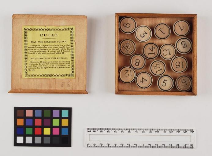 | Keywords: Bodleian Libraries, Calculator puzzles. Two games in one.jpg  Game entitled Calculator puzzles Two games in one; wooden box with circular wooden blocks numbered 1-16 Label on inside of lid with rules printed in yellow Box lid label printed in green; Regular posers; Sixteen puzzle no 1 ; Fifteen puzzle no 2 ; Image 2 box 16 discs; 115 x 115 x 26 mm exhibition history Allegro identifier 20040911/10 19 11 jl object history object type Licensed-PD-Art PD-old-100 cc-by-4 0 place of creation place of discovery http //digital bodleian ox ac uk/inquire/p//a327fbc9-8e01-410b-bac1-2235170f9139 Digital Bodleian Template John Johnson Calculator puzzles Two games in one Uploaded with GWToolset Bodleian Libraries Calculator puzzles Two games in one http //iiif bodleian ox ac uk/iiif/image/9a16bb53-f2a4-4583-bda5-e6a26b797977/full/ 1000 1000/0/default jpg Files uploaded by the Bodleian Libraries' Wikimedian In Residence Educational games Games in mathematics education |