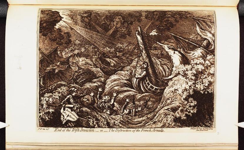 | Keywords: Bodleian Libraries, End of the Irish invasion or - The destruction of the French armada.jpg accession number Curzon b 18 93 Satire on the fear of French invasion 1794-1805 British political cartoon ; The French invasion force making for Bantry Bay Ireland is blown by winds from the mouths of British government figures Charles James Fox is the figurehead of one ship while his Whig allies in The Revolutionary Jolly boat are swamped by the waves ; Not coloured 273 x 380 sheet mm; aquatint exhibition history Source filename politi004-arm-0001-0 object history object type Licensed-PD-Art PD-old-100 cc-by-4 0 place of creation London England Hannah Humphrey place of discovery http //digital bodleian ox ac uk/inquire/p//0ee2de32-c373-42f1-81cc-e665b23b616f Digital Bodleian Template Bodleian Libraries End of the Irish invasion; -- or -- The destruction of the French armada Uploaded with GWToolset Bodleian Libraries End of the Irish invasion or The destruction of the French armada http //iiif bodleian ox ac uk/iiif/image/0ee2de32-c373-42f1-81cc-e665b23b616f/full/ 1000 1000/0/default jpg Files uploaded by the Bodleian Libraries' Wikimedian In Residence Napoleonic Wars Anglo-French War Ireland--History--Rebellion of 1798 Charles James Fox Curzon Collection |