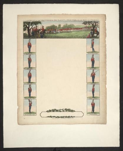 | Keywords: Bodleian Libraries, Grand review of the Volunteers by His Majesty in Hyde Park, and the manual exercise.jpg Writing blank of 1803 entitled A grand review of the Volunteers by His Majesty in Hyde Park and the manual exercise; Shoulder arms; Order arms; Attention; Present arms 1st motn ; Present arms 2nd motn ; Present arms 2nd motn ; Fix bayonet; Port arms; Charge bayonet; Stand at ease; Grand review of the Volunteers by His Majesty in Hyde Park and the manual exercise single sheet; 448 x 335 mm; paper exhibition history Allegro identifier 20031127/17 23 35 jl object history object type Licensed-PD-Art PD-old-100 cc-by-4 0 place of creation London England Robert Laurie and James Whittle place of discovery http //digital bodleian ox ac uk/inquire/p//bd5dae4c-30d9-4346-85a6-cac190bceca6 Digital Bodleian Template John Johnson Grand review of the Volunteers by His Majesty in Hyde Park and the manual exercise Uploaded with GWToolset Bodleian Libraries Grand review of the Volunteers by His Majesty in Hyde Park and the manual exercise http //iiif bodleian ox ac uk/iiif/image/bd5dae4c-30d9-4346-85a6-cac190bceca6/full/ 1000 1000/0/default jpg Files uploaded by the Bodleian Libraries' Wikimedian In Residence Writing blanks Military education Military inspections Kings Military training People with bayonets Military uniforms Robert Laurie |