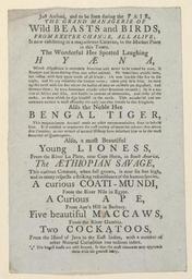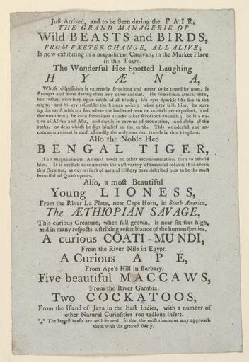 | Keywords: Bodleian Libraries, Handbill of 1790, announcing The grand menagerie sic of wild beasts and birds, from Exeter Change.jpg Handbill of 1790 announcing The grand menagerie sic of wild beasts and birds from Exeter Change; Grand menagerie sic of wild beasts and birds from Exeter Change; Just arrived and to be seen during the fair the grand managerie sic of wild beasts and birds from Exeter Change all alive; is now exhibiting in a magnificent caravan in the market place in this town The wonderful hee spotted laughing hyena ; Pidcock's exhibition of wild beasts; Handbill of 1790 announcing The grand menagerie sic of wild beasts and birds from Exeter Change single sheet; 189 x 125 mm exhibition history 003769; t161013 object history object type Licensed-PD-Art PD-old-100 cc-by-4 0 place of creation place of discovery http //digital bodleian ox ac uk/inquire/p//6e2c7cd6-72cc-4dbd-9d60-94b6e8853b46 Digital Bodleian Template John Johnson Handbill of 1790 announcing The grand menagerie sic of wild beasts and birds from Exeter Change Uploaded with GWToolset Bodleian Libraries Handbill of 1790 announcing The grand menagerie sic of wild beasts and birds from Exeter Change http //iiif bodleian ox ac uk/iiif/image/6e2c7cd6-72cc-4dbd-9d60-94b6e8853b46/full/ 1000 1000/0/default jpg Files uploaded by the Bodleian Libraries' Wikimedian In Residence Hyaenidae Tigers in art Panthera leo Coatis Hominoidea Parrots in art Exhibitions Menageries |