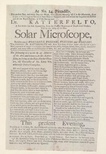 | Keywords: Bodleian Libraries, Handbill announcing Wonderful wonders, wonders and wonders.jpg Handbill announcing Wonderful wonders wonders and wonders; The celebrated Dr Katterfelto will shew in a drop of clear water the size of a pin's head upwards of 10000 live insects; the same in beer milk vinegar blood flour cheese mareschal powder and many different christilization of salts c and 400 other curious objects Has vese by an admirer of the Arts and Sciences ; Wonderful wonders wonders and wonders; New grand medley entertainments; Deceptions on dice cards billiards letters money watches silver and gold boxes medals pyramidical glasses mechanical clocks c ; At no 24 Piccadilly this present day and every day this week from 9 in the morning till 6 in the afternoon there is now to be seen a great variety of new occult sciences or if the sun appears Dr Katterfelto will by the help of his new solar microscope exhibit many wonderful wonders ; Katterfelto Gustavus d 1799; Handbill announcing Wonderful wonders wonders and wonders single sheet; 275 x 177 mm exhibition history As venal puppets of the mimic stage first line of verse 003232; t160708 object history object type Licensed-PD-Art PD-old-100 cc-by-4 0 place of creation place of discovery http //digital bodleian ox ac uk/inquire/p//89164425-41f6-4de9-b800-313243bf1708 Digital Bodleian Template John Johnson Handbill announcing Wonderful wonders wonders and wonders Uploaded with GWToolset Bodleian Libraries Handbill announcing Wonderful wonders wonders and wonders http //iiif bodleian ox ac uk/iiif/image/89164425-41f6-4de9-b800-313243bf1708/full/ 1000 1000/0/default jpg Files uploaded by the Bodleian Libraries' Wikimedian In Residence Microscopes Solar System Black cats Piccadilly London England microscope solar |