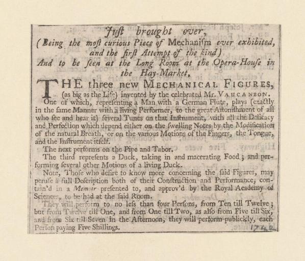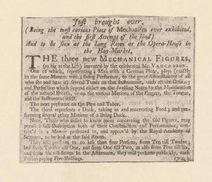 Keywords: Bodleian Libraries, Just brought over, (being the most curious piece of mechanism ever exhibited, and the first attempt of the kind) and to be seen at the Long Room at the Opera House in the Hay-market.jpg Newscutting relating to the Long Room 1742 announcing mechanical musical instruments and other mechanical exhibits; 1742 manuscript ; Man with a German flute; Man playing the pipe and tabor; Duck; Just brought over being the most curious piece of mechanism ever exhibited and the first attempt of the kind and to be seen at the Long Room at the Opera House in the Hay-market single sheet; 68 x 82 mm exhibition history Three new mechanical figures as big as the life invented by the celebrated Mr Vauncanson One of which representing a man Allegro identifier 20030523/11 16 54 hm object history object type Licensed-PD-Art PD-old-100 cc-by-4 0 place of creation place of discovery http //digital bodleian ox ac uk/inquire/p//64d14536-6073-4e3f-9422-68a679454be0 Digital Bodleian Template John Johnson Just brought over being the most curious piece of mechanism ever exhibited and the first attempt of the kind and to be seen at the Long Room at the Opera House in the Hay-market Uploaded with GWToolset Bodleian Libraries Just brought over being the most curious piece of mechanism ever exhibited and the first attempt of the kind and to be seen at the Long Room at the Opera House in the Hay-market http //iiif bodleian ox ac uk/iiif/image/64d14536-6073-4e3f-9422-68a679454be0/full/ 1000 1000/0/default jpg Files uploaded by the Bodleian Libraries' Wikimedian In Residence Musical instruments Exhibitions Mechanical toys Pipes Tabor Robots Clippings automata |