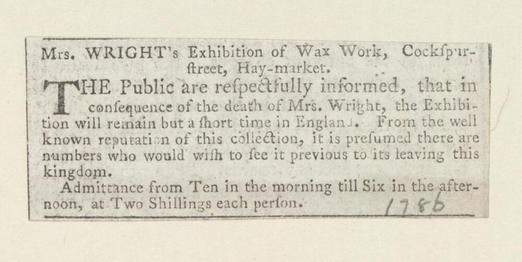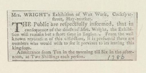 Keywords: Bodleian Libraries, Mrs. Wright's exhibition of wax work, Cockspur-street, Hay-market.jpg Newscutting relating to Mrs Wright's exhibition of waxworks; 1786 manuscript ; Mrs Wright's exhibition of waxworks; Mrs Wright's exhibition of wax work Cockspur-street Hay-market single sheet; 27 x 71 mm exhibition history Public are respectfully informed that in consequence of the death of Mrs Wright the exhibition will remain but a short time in England Allegro identifier 20030527/17 00 52 hm object history object type Licensed-PD-Art PD-old-100 cc-by-4 0 place of creation place of discovery http //digital bodleian ox ac uk/inquire/p//019a5fce-73e5-46fd-ae5d-a343c474206a Digital Bodleian Template John Johnson Mrs Wright's exhibition of wax work Cockspur-street Hay-market Uploaded with GWToolset Bodleian Libraries Mrs Wright's exhibition of wax work Cockspur-street Hay-market http //iiif bodleian ox ac uk/iiif/image/019a5fce-73e5-46fd-ae5d-a343c474206a/full/ 1000 1000/0/default jpg Files uploaded by the Bodleian Libraries' Wikimedian In Residence Exhibitions Waxworks plastic arts Clippings Wright Mrs |