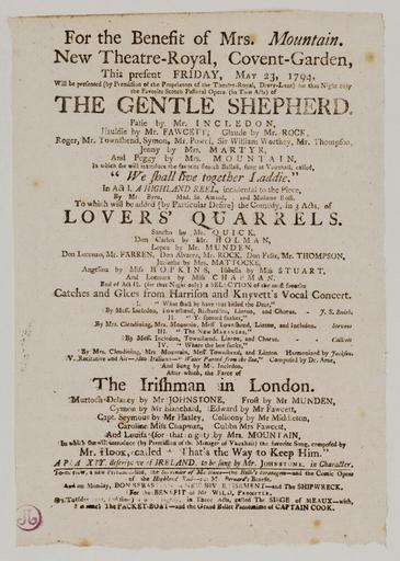 | Keywords: Bodleian Libraries, Playbill of Covent Garden, Friday, May 23, 1794, announcing The gentle shepherd &c..jpg Playbill of Covent Garden Friday May 23 1794 announcing The gentle shepherd c for the benefit of Mrs Mountain; Gentle shepherd; We shall live together laddie; Highland reel; Lovers' quarrels; Catches and glees from Harrison and Knyvett's vocal concert; What shall he have that killed the deer; Ye spotted snakes; New mariners; Where the bee sucks; Water parted from the sea; Irishman in London; That's the way to keep him; Planxty descriptive of Ireland; Surrender of Martinico; Belle's stratagem; Highland reel; Don Sebastian; Shipwreck; Siege of Meaux; Packet-boat; Captain Cook; Playbill of Covent Garden Friday May 23 1794 announcing The gentle shepherd c single sheet; 255 x 179 mm exhibition history For the benefit of Mrs Mountain Allegro identifier 20010706/09 08 44 af object history object type Licensed-PD-Art PD-old-100 cc-by-4 0 place of creation s l England s n place of discovery http //digital bodleian ox ac uk/inquire/p//71d4430a-cda4-4e30-968c-36e370d4320c Digital Bodleian Template John Johnson Playbill of Covent Garden Friday May 23 1794 announcing The gentle shepherd c Uploaded with GWToolset Bodleian Libraries Playbill of Covent Garden Friday May 23 1794 announcing The gentle shepherd c http //iiif bodleian ox ac uk/iiif/image/71d4430a-cda4-4e30-968c-36e370d4320c/full/ 1000 1000/0/default jpg Files uploaded by the Bodleian Libraries' Wikimedian In Residence Playbills Scotch pastoral opera Harrison Samuel |
