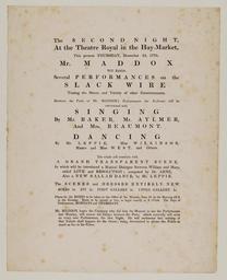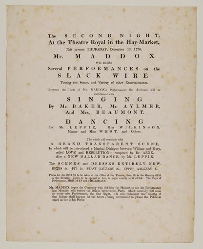 Keywords: Bodleian Libraries, Playbill (facsimile) of Haymarket Theatre, Thursday, December 13, 1770, announcing A grand transparent scene &c..jpg Playbill facsimile of Haymarket Theatre Thursday December 13 1770 announcing A grand transparent scene c ; facsimile ; Grand transparent scene; Love and resolution; New ballad dance; Playbill facsimile of Haymarket Theatre Thursday December 13 1770 announcing A grand transparent scene c single sheet; 284 x 227 mm exhibition history Mr Maddox will exhibit several performances on the slack wire Allegro identifier 20020322/15 28 09 af object history object type Licensed-PD-Art PD-old-100 cc-by-4 0 place of creation s l England s n place of discovery http //digital bodleian ox ac uk/inquire/p//335bddd1-2e04-42d6-9d8c-f4e65cf7a717 Digital Bodleian Template John Johnson Playbill facsimile of Haymarket Theatre Thursday December 13 1770 announcing A grand transparent scene c Uploaded with GWToolset Bodleian Libraries Playbill facsimile of Haymarket Theatre Thursday December 13 1770 announcing A grand transparent scene c http //iiif bodleian ox ac uk/iiif/image/335bddd1-2e04-42d6-9d8c-f4e65cf7a717/full/ 1000 1000/0/default jpg Files uploaded by the Bodleian Libraries' Wikimedian In Residence Tightrope walking Child actors Playbills transparency slack wire performer |