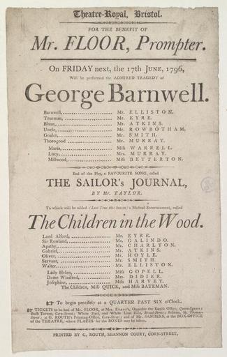 Keywords: Bodleian Libraries, Playbill of the Theatre Royal, Friday next, the 17th June 1796, announcing George Barnwell.jpg Playbill of the Theatre Royal Friday next the 17th June 1796 announcing George Barnwell for the benefit of Mr Floor; George Barnwell; Sailor's journal; Children in the wood; Playbill of the Theatre Royal Friday next the 17th June 1796 announcing George Barnwell single sheet; 287 x 177 mm exhibition history For the benefit of Mr Floor prompter 010969 object history object type Licensed-PD-Art PD-old-100 cc-by-4 0 place of creation Bristol England Routh G place of discovery http //digital bodleian ox ac uk/inquire/p//ba7583d4-0c0a-4cb9-ba5d-c0d2d501eb4b Digital Bodleian Template John Johnson Playbill of the Theatre Royal Friday next the 17th June 1796 announcing George Barnwell Uploaded with GWToolset Bodleian Libraries Playbill of the Theatre Royal Friday next the 17th June 1796 announcing George Barnwell http //iiif bodleian ox ac uk/iiif/image/ba7583d4-0c0a-4cb9-ba5d-c0d2d501eb4b/full/ 1000 1000/0/default jpg Files uploaded by the Bodleian Libraries' Wikimedian In Residence Theater England--Bristol--History--18th century Playbills Tragedies |