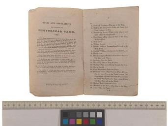 Keywords: Bodleian Libraries, Rules and directions for playing the Historical pastime or new game of the History of England 164.jpg Game entitled Rules and directions for playing the Historical pastime or new game of the History of England; This game comprehends one hundred and thirty two of the principal circumstances in the History of England commencing with the Battle of Hastings and ending with George the Fourth with appropriate fines or rewards to most of the subjects It is played with a tetotum numbered from 1 to 8 Each player proceeds in the game according to the number he turns and receives the reward or pays the fine appointed There are likewise twelve letters one of which each player must draw; and he who draws the earliest in the alphabet takes the privilege of turning first and the others in rotation Each player must place his letter on the circumstance to which he turns to show his situation in the game If any player turns to that subject on which another has his letter he takes that place and the other moves one forward except at the Holy Lane where as many may be placed as chance may send Each player advances in the game by adding the figure that he turns to the number on which his letter stands Any number of persons may play; and he who arrives first at the Treasury wins the game takes the stakes and all forfeits that remain No 1 Battle of Hastings - pay one to the King No 2 William the Conqueror Take all fines that have been paid to him No 3 Doom's-day book - where every player must enter before he can proceed etc ; Historical pastime or new game of the History of England; Image 3 booklet 24p ; 165 x 105 mm exhibition history Allegro identifier 20030930/17 45 05 jl object history object type Licensed-PD-Art PD-old-100 cc-by-4 0 place of creation London England E Wallis place of discovery http //digital bodleian ox ac uk/inquire/p//1422e4df-dbeb-4904-a576-1f017cb427c0 Digital Bodleian Template John Johnson Rules and directions for playing the Historical pastime or new game of the History of England Uploaded with GWToolset Bodleian Libraries Rules and directions for playing the Historical pastime or new game of the History of England_164 http //iiif bodleian ox ac uk/iiif/image/80df0e9c-7122-47f0-9d2c-0357ea7ee32d/full/ 1000 1000/0/default jpg Files uploaded by the Bodleian Libraries' Wikimedian In Residence Board game rules History of Great Britain |