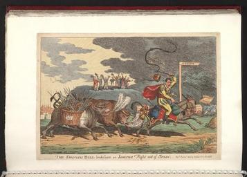 Keywords: Bodleian Libraries, The Spanish bull broke loose or- Josephs flight out of Spain.jpg Satire on the Peninsular war British political cartoon ; Two bulls labelled John Bull and Don Bull chase Joseph Bonaparte out of Spain Puffs of 'liberty' emerge from the nostrils of the bulls and John Bull is carrying a pannier of arms labelled G III Rex Joseph is riding an ass laden with bags of gold and dollars On a cliff in the background small figures of the rulers of Europe cheer Joseph's departure Behind the bulls the city of Madrid is lit by the sun of Patriotism while Joseph's flight takes him into a thunderstorm ; Colouring differs from BM copy as described in BMC 263 x 377 mm; etching exhibition history Source filename politi004-ade-0001-0 object history object type Licensed-PD-Art PD-old-100 cc-by-4 0 place of creation London England Walker place of discovery http //digital bodleian ox ac uk/inquire/p//a4787c74-6fb9-4a32-983d-4f2e75259ecf Digital Bodleian Template Bodleian Libraries The Spanish bull broke loose or Josephs flight out of Spain Uploaded with GWToolset Bodleian Libraries The Spanish bull broke loose or Josephs flight out of Spain http //iiif bodleian ox ac uk/iiif/image/a4787c74-6fb9-4a32-983d-4f2e75259ecf/full/ 1000 1000/0/default jpg Files uploaded by the Bodleian Libraries' Wikimedian In Residence Napoleonic Wars Peninsular War Joseph Bonaparte Animals in art A correct plan and elevation of the famous French raft constructed on purpose for the invasion of England and intended to carry 30 000 men ammunition stores c c George III of the United Kingdom Curzon Collection