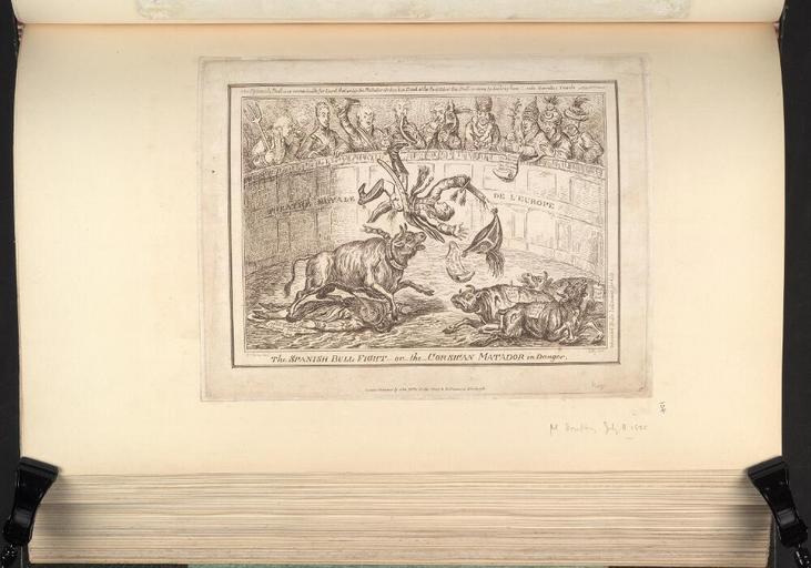 Keywords: Bodleian Libraries, The Spanish bull fight, or,- the Corsican matador in danger.jpg Satire on the Peninsular war British political cartoon ; The crowned heads of Europe watch and cheer as Napoleon is gored by the Spanish bull his brother Joseph Bonaparte trampled under the animal's hooves ; Not in BMC A copy of a cartoon by James Gillray BMC 10997 252 x 356 sheet mm exhibition history Source filename politi004-axj-0001-0 object history object type Licensed-PD-Art PD-old-100 cc-by-4 0 place of creation London England S W Fores place of discovery http //digital bodleian ox ac uk/inquire/p//6aa3031e-4e2a-473f-8e64-83148d244903 Digital Bodleian Template Bodleian Libraries The Spanish bull fight or the Corsican matador in danger Uploaded with GWToolset Bodleian Libraries The Spanish bull fight or the Corsican matador in danger http //iiif bodleian ox ac uk/iiif/image/6aa3031e-4e2a-473f-8e64-83148d244903/full/ 1000 1000/0/default jpg Files uploaded by the Bodleian Libraries' Wikimedian In Residence Napoleonic Wars Peninsular War George III of the United Kingdom Francis II Holy Roman Emperor John VI King of Portugal 1767-1826 Alexander I of Russia in caricatures Friedrich Wilhelm III of Prussia Caricatures of Napoleon I of France Joseph Bonaparte Gustaf IV Adolf King of Sweden 1778-1837 Pius VII in art Mustafa IV Sultan of the Turks 1779-1808 National stereotypes -- Algiers Animals in art Curzon Collection |