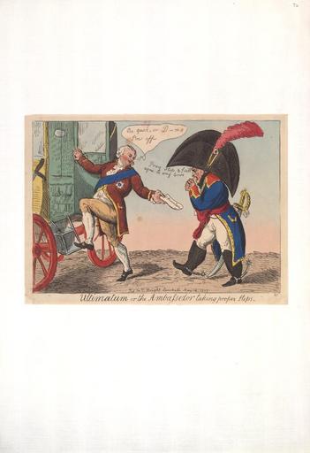 | Keywords: Bodleian Libraries, Ultimatum or- the ambassedor taking proper steps.jpg accession number Curzon b 12 76 Satire on the Napoleonic wars British political cartoon ; The British Ambassador Whitworth steps into his carriage offering Napoleon an ultimatum Bonaparte is weeping and clasping his hands ; Numbered in red ink 22 Krumbhaaar 1252 197 x 275 sheet mm exhibition history Source filename politi004-apx-0001-0 object history object type Licensed-PD-Art PD-old-100 cc-by-4 0 place of creation London England T Knight place of discovery http //digital bodleian ox ac uk/inquire/p//2d183ebf-3029-45c5-906f-e924a72c3d7c Digital Bodleian Template Bodleian Libraries Ultimatum or the ambassedor taking proper steps Uploaded with GWToolset Bodleian Libraries Ultimatum or the ambassedor taking proper steps http //iiif bodleian ox ac uk/iiif/image/2d183ebf-3029-45c5-906f-e924a72c3d7c/full/ 1000 1000/0/default jpg Files uploaded by the Bodleian Libraries' Wikimedian In Residence Napoleonic Wars Whitworth Charles Whitworth Earl 1752-1825 Caricatures of Napoleon I of France Curzon Collection |
