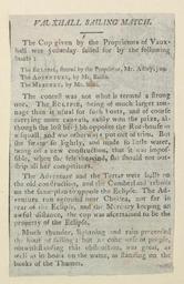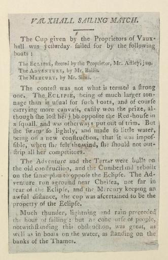 | Keywords: Bodleian Libraries, Vauxhall Sailing Match.jpg Newscutting relating to a Sailing match; Sailing match; Vauxhall Sailing Match single sheet; 109 x 68 mm exhibition history Cup given by the proprietors of Vauxhall was yesterday sailed for by the following boats the Eclipse steered by the proprietor Mr Astley jun The Adventure by Mr Bailis The Mercury by Mr Sims Allegro identifier 20030609/10 22 22 hm object history object type Licensed-PD-Art PD-old-100 cc-by-4 0 place of creation place of discovery http //digital bodleian ox ac uk/inquire/p//66be68cb-5335-4b69-9767-4d244bc3b4db Digital Bodleian Template John Johnson Vauxhall Sailing Match Uploaded with GWToolset Bodleian Libraries Vauxhall Sailing Match http //iiif bodleian ox ac uk/iiif/image/66be68cb-5335-4b69-9767-4d244bc3b4db/full/ 1000 1000/0/default jpg Files uploaded by the Bodleian Libraries' Wikimedian In Residence Clippings Prizes Rivers in art Blackfriars Bridge London England Westminster Bridge London England Vauxhall Gardens sailing match Roberts Mr |