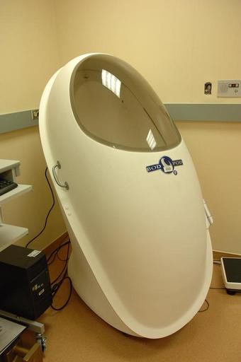 | Keywords: BodPod.jpg en The BodPod in the Metabolic Clinical Research Unit of the National Institute of Diabetes and Digestive and Kidney Diseases is used to provide a whole-body measurement of body volume Together with weight this is used to determine the overall lean and fat mass in a participant In this test participants sit inside the capsule while computerized pressure sensors determine the amount of air displaced by their body 2007-01-09 https //www flickr com/photos/nihgov/20228759914/in/album-72157656890787872/ The National Institutes of Heatlh other versions PD-USGov Medical equipment |