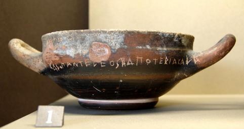 | Keywords: Boeotian cup Louvre MNC671.jpg  Drinking inscription Boeotian alphabet Black-glaze Boeotian cup 5th century BC From Cynos Livanatas Locris Formule à boire en alphabet béotien Coupe béotienne à vernis noir Ve siècle av J -C Provenance Cynos Livanatas en Locride H 5 70 cm; L 18 90 cm; D 12 40 cm Museum Louvre Department of Greek Etruscan and Roman Antiquities Sully first floor room 39 passage 2 object history credit line Purchase 1884 accession number MNC 671 Bibi Saint-Pol own work 2007-09-09 other versions Boeotian inscriptions Ancient Greek cups Ancient Greek black-glaze pottery Boeotian pottery Greek antiquities in the Louvre - Room 39 5th-century BC pottery Ancient Greek graffiti |
