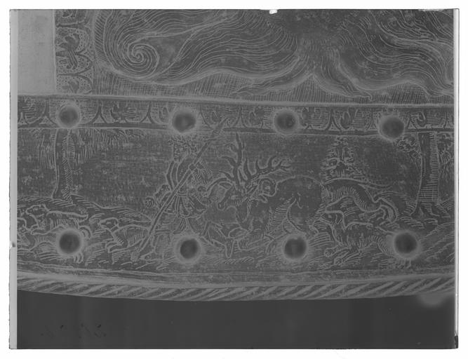 Keywords: Bogpansar till hästrusning, troligen tillhörigt Johan III, 1500-tal - Livrustkammaren - 79454-negative.tif LSH artwork sv Bestående av sammanlagt elva sammanfogade plåtar med utsidan dekorerad av etsat mönster och rött sammetstyg U-formigt böjt med svagt sluttande sidor och kraftigare sluttande framparti Ram av fyra skenor med ytterkanterna omvikta rundsmidda och djupt repstavsfilade Mittenpartiet utgörs av sju plåtar nitade vid varandra Samtliga nitar har ursprungligen haft brickor på insidan och kullriga mässingsskallar på utsidan Baktill och upptill i var kant ett brunt läderband med nio hål L 295 B 43 mm fäst med två nitar varav de två nedre med blomformig bricka av mässing Plåtarnas insidor är mörbruna längs övre och nedre kanten är nitarna fästade genom 20 mm breda läderband Ramen har heltäckande etsad dekor På övre delen slingrande växtrankor och mytologiska figurer som kentaurer på nedre delen jaktscener med jägare hästar jakthundar och villebråd som hjortar vildsvin och harar På plåtarna som utgör bakre gavlarna finns större motiv På den ena stryper en stående Herakles det nemeiska lejonet under scenen ruta med texten HERKVLES På andra sidan man med långt skägg svärd samt rustning all'antica därunder textruta IOS APHAI Av de sju mittenplåtarna är nr 2 7 drivna och punsade som lejonhuvuden i hög relief med graverade detaljer som hår ögon och tänder Den främsta nr 4 har etsad Herkules med lejonmantel i färd att kasta omkull en fiende nertill textruta HERKVLES Övriga plåtar är helt täckta av pålimmad mörkröd sammet original caption century 16 velvet Färg mörkt röd material sammet - leather Färg brun material läder - brass Färg gul material mässing - steel g 6450 size mm 720 690 357 LRK Johan III av Sverige Tre Konungar på Åbo slott 1993 Björneborg - Johans stad Satakunta Museum Björneborg/Pori 2008 Trofast - hov och tass i kunglig tjänst 2010-2011 Livrustkammaren Trogna vänner - Kungliga hästar och hundar 2011-2012 Museiverket/Finlands nationalmuseum place of origin original filename LN_E02855 59503 inventory number LRK 22861 79454 CC0 Bogpansar till hästrusning troligen tillhörigt Johan III 1500-tal - Livrustkammaren - 79454 tif <gallery caption Different images of same object > File Bogpansar till hästrusning troligen tillhörigt Johan III 1500-tal - Livrustkammaren - 44085 tif File Bogpansar till hästrusning troligen tillhörigt Johan III 1500-tal - Livrustkammaren - 35526 tif File Utställningsbild sadlar hästrustningar mm - Livrustkammaren - 77173 tif </gallery> <gallery caption Related objects > File Manpansar möjligen tillhörigt Johan III 1500-talets mitt - Livrustkammaren - 19537 tif LRK 22860 File Ländpansar till hästrustning troligen tillhörigt Johan III 1500-tal - Livrustkammaren - 79460 tif LRK 22862 File Manpansar möjligen tillhörigt Johan III 1500-talets mitt - Livrustkammaren - 36657 tif LRK 22860 File Manpansar möjligen tillhörigt Johan III 1500-talets mitt - Livrustkammaren - 62337 tif LRK 22860 File Ländpansar till hästrustning troligen tillhörigt Johan III 1500-tal - Livrustkammaren - 70895 tif LRK 22862 File Manpansar möjligen tillhörigt Johan III 1500-talets mitt - Livrustkammaren - 70899 tif LRK 22860 File Ländpansar till hästrustning troligen tillhörigt Johan III 1500-tal - Livrustkammaren - 36659 tif LRK 22862 File Manpansar möjligen tillhörigt Johan III 1500-talets mitt - Livrustkammaren - 79458 tif LRK 22860 File Manpansar möjligen tillhörigt Johan III 1500-talets mitt - Livrustkammaren - 53776 tif LRK 22860 File Ländpansar till hästrustning har troligen tillhört Johan III 1500-tal - Livrustkammaren - 10975 tif LRK 22862 File Ländpansar till hästrustning troligen tillhörigt Johan III 1500-tal - Livrustkammaren - 2415 tif LRK 22862 File Manpansar möjligen tillhörigt Johan III 1500-talets mitt - Livrustkammaren - 45215 tif LRK 22860 File Manpansar möjligen tillhörigt Johan III 1500-talets mitt - Livrustkammaren - 10973 tif LRK 22860 File Manpansar möjligen tillhörigt Johan III 1500-talets mitt - Livrustkammaren - 28096 tif LRK 22860 File Manpansar möjligen tillhörigt Johan III 1500-talets mitt - Livrustkammaren - 2413 tif LRK 22860 File Manpansar möjligen tillhörigt Johan III 1500-talets mitt - Livrustkammaren - 35519 tif LRK 22860 </gallery> |