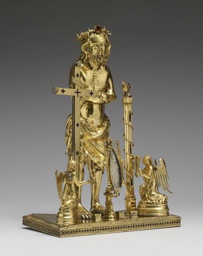 | Keywords: Bohemian - Reliquary with the Man of Sorrows - Walters 57700 - Three Quarter Right.jpg  The image of the Man of Sorrows is a distillation of the events of Christ's Passion Christ contemplates with sorrow the instruments of his suffering the cross and hammer whips nails column of the Flagellation and the dice thrown by the soldiers for his garments The gabled container held by an angel once housed a thorn believed to be from Christ's Crown of Thorns while the hinged cross and column probably held pieces of wood believed to be from Christ's cross and from the column against which he was whipped According to an inscription on the base the reliquary was ordered by the bishop of Olomouc in Moravia to house the Holy Thorn It was surely a present for Holy Roman Emperor Charles IV Both men's coats of arms those of Moravia and Bohemia are on the base and the thorn was already in the emperor's famous collection of relics as a gift from the king of France As Charles reigned over both Bohemia and Moravia only from 1347 to 1349 the piece dates to this time The sophisticated workmanship is characteristic of objects created for the imperial court in Prague between 1347 1349 Medieval gilded silver silver champlevé enamel glass paste imitation ruby H 11 5/8 x W at wings 8 3/8 x D 5 in 29 53 x 21 27 x 12 7 cm accession number 57 700 29555 Jacques Seligmann Paris date and mode of acquisition unknown Henry Walters Baltimore June 9 1903 by purchase Walters Art Museum Henry Walters Acquired by Henry Walters 1903 Transcription Majuscule inscription on the pedestal HANC MONSTRANCIAM CUM SPINA CHORONE DOMINI DNS IOHANNES OLOMUCZENSIS EPISCOPUS PREPARARI FECIT Translation John the bishop of Olmütz commissioned this monstrance with the thorn of the crown of Christ The Way to Heaven Relic Veneration in the Middle Ages Museum Catharijneconvent Utrecht; Nieuwe Kerk Amsterdam Amsterdam 2000-2001 The International Style The Arts in Europe Around 1400 The Walters Art Gallery Baltimore 1962 Kaiser Karl IV 1316-1378 Bayerisches Nationalmuseum Munich 1978 Die Parler und der Schöne Stil 1350-1400 Schnütgen-Museum Cologne 1978-1979 Reliquaries and Ritual Medieval Objects of Devotion The Walters Art Gallery Baltimore 1984-1985 Highlights from the Collection The Walters Art Gallery Baltimore 1998-2001 Prague The Crown of Bohemia The Metropolitan Museum of Art New York; Prague Castle Prague 1 2005-2006 Silesia - A Pearl in the Bohemian Crown Three Periods of Flourishing Artistic Relations Waldstein Riding School Prague Prague 2006-2007 Treasures of Heaven The Cleveland Museum of Art Cleveland; The Walters Art Museum Baltimore; The British Museum London 2010-2011 place of origin Prague Czech Republic Walters Art Museum license Bohemian Reliquary with the Man of Sorrows in the Walters Art Museum Medieval reliquaries Bohemia Media contributed by the Walters Art Museum needs category review Media contributed by the Walters Art Museum needs artist review |