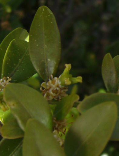 Keywords: Boix fructificat CP.JPG en Buxus sempervirens showing inmature green trilocule capsule Castelltallat Catalonia ca Boix comú Buxus sempervirens mostrant la càpsula de tres lòculs encara verda a Castelltallat Bages own Victor M Vicente Selvas 03/04/2007 41º 47 ' N 1º 38' E 800 msnm Buxus sempervirens leaves