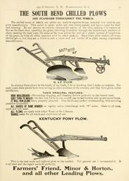 Keywords: Bolgiano's 1902 catalogue (15727593114).jpg 935 B Strkkt N W Washington D C <br> 35 <br> THE SOUTH BEND CHILLED PLOWS <br> ARE STANDARD THROUGHOUT THE WORLD <br> The chilled metal of which our plows are made is superior to any material ever used by any <br> plow manufacturer This metal is made under our own letters patent and has no equal for wear <br> and scouring By our process we entirely changed the nature of the iron making it in texture as <br> fine as the finest steel upsetting the grain throwing it endwise through the mouldboard landsiue or <br> share making the wear come the same as the wear across the end of a plank instead of lengthwise <br> of the grain as with all other material used by other makers Many other plow makers advertise <br> chilled plo \s but they are a delusion and a snare and not worthy of a place among respectable <br> manufacturers <br> 50UT« B EiiD <br> R 4 F PLOW <br> In placing these plows in the hands of my trade I do so knowing that I make no mistake For <br> eight years these plows have been selling in other sections of the country and they have given entire <br> satisfaction <br> THEIR PRINCIPAL FEATURES <br> HIGH MOULDBOARD ” Preventing clogging and cleaning furrow perfectly in the loosest land <br> EASY TURN TO MOULD ” So that sod let be it ever so stiff can be laid bottom side up and never break <br> IT WILL RUN ALONE when properly adjusted Fine finish and perfect workmanship with scouring <br> qualities unexcelled <br> ALL SHARES OF SAME NUMBER on regular series interchange with F series Made in all sizei <br> right and left hand <br> ALL PLOWS are made with either Wood or Ste d Beams <br> SHARES made f° r all kinds and conditions of soil <br> KENTUCKY PONY PLOW <br> This is the best made and lightest plow on the market <br> is all steel and the repair parts fit perfectly <br> For general use I recommend it It <br> Farmers' Friend Minor Horton <br> and all other Leading Plows 42156285 132756 65911 Page 35 Text http //www biodiversitylibrary org/page/42156285 1902 10 5962/bhl title 65911 F W Bolgiano Co ; Henry G Gilbert Nursery and Seed Trade Catalog Collection Biodiversity Heritage Library Bolgiano's 1902 catalogue tested seeds for the garden and farm Garden Stories Bulbs Plants Catalogs Fruit Garden tools Nurseries Horticulture Seeds Vegetables U S Department of Agriculture National Agricultural Library bhl page 42156285 dc identifier http //biodiversitylibrary org/page/42156285 bhlGardenStories BHLinbloom bulbs plants nurseries horticulture u s department of agriculture national agricultural library bhlgardenstories bhlinbloom Information field Flickr posted date ISOdate 2015-01-23 Check categories 2015 August 24 CC-BY-2 0 BioDivLibrary https //flickr com/photos/61021753 N02/15727593114 2015-08-24 08 52 27 cc-by-2 0 PD-old-70-1923 Bolgiano's 1902 catalogue Photos uploaded from Flickr by Fæ using a script